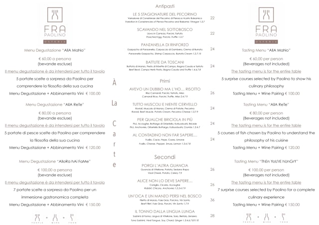 10/10Our dinner at Fra Paolino was a highlight of two weeks in Italy. Every aspect was exceptional: the food was beautiful, creative, and utterly delicious! We tried the tasting menu and were so glad we did. Each course was introduced and explained by our server, who was more like a friendly, knowledgeable host. The staff was happy to accommodate a couple of allergy/preference issues. The wines were equally delicious. The ambience was warm, low-key, and sophisticated. We would all go back again tomorrow if only we didn’t live so far away!