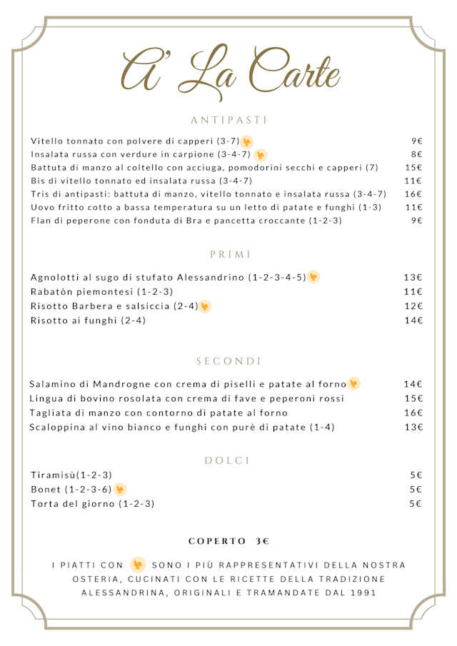 ItalianMeat CuisinePiemonteseTraditional cuisineEuropeanFine DiningOsteriaTraditionalBlack FridayTheFork FestivalGluten freeVegetarian dishesAmerican ExpressDog-FriendlyWheelchair AccessibleWifi