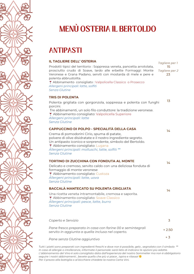 10/10Osteria I’ll Bertoldo was such a delightful surprise. Tucked away from all the hustle and bustle on the busy tourist streets it was a charming and delicious choice for a Sunday afternoon. Exceptional service by Enrico made the whole experience extra special for two Canadians with no Italian language abilities. The food was superb … we had some wonderful meals in Verona (including 3 star Michelin) but for overall experience this was every bit as enjoyable possibly more if you want old world elegance and cozy ambiance.