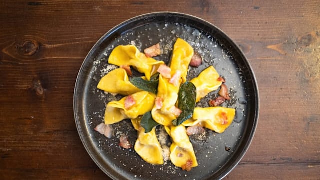 Pasta ripiena con farcia di carne e grana padano condita con burro, pancetta e salvia fritta