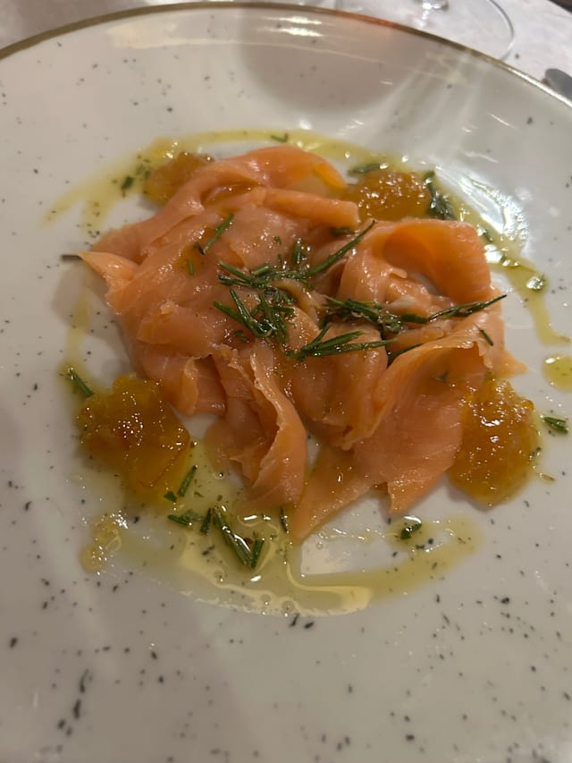 Covaccino con salmone Marinato al Timo, Olio al Rosmarino, Confettura di Arancia Amara