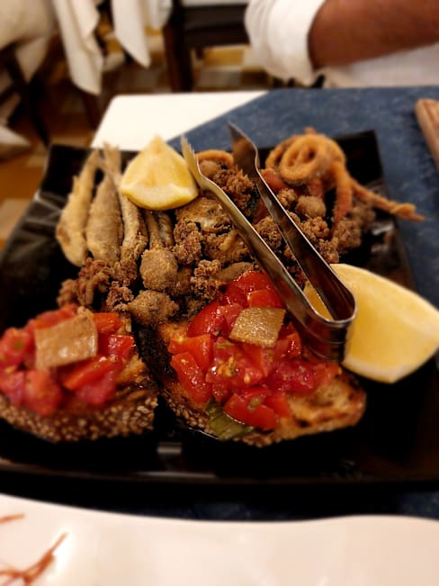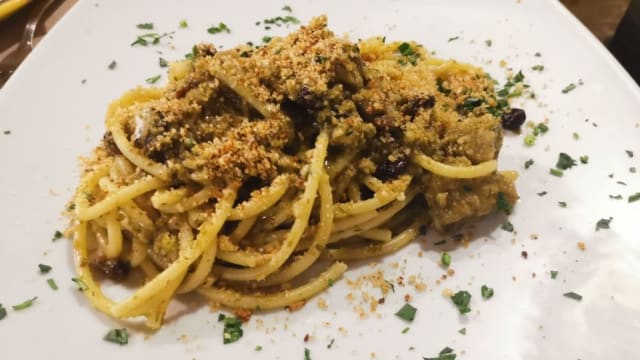 7/10The decor was tired, and having booked a table the previous day we were placed next to the toilet and a pile of paper deliveries. The food was “ok” but the mixed fish starter for 2 was disappointing, with much less fish in it than expected, and my bucatini con sarde had a good sauce, but the pasta did not taste like fresh pasta. My partner’s sepia was good. I would not rush to make a return visit