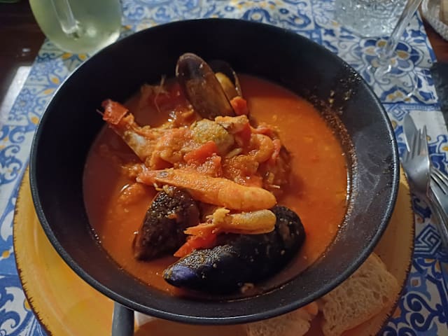senza lische, cambia i suoi ingredienti a seconda del pescato, ritrova sempre il sapore dei muscoli e vongole (*molluschi, crostacei, pesce, pomodoro, aglio)