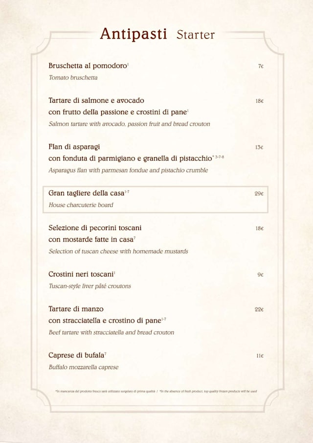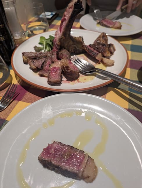 9/10Super kind servers. They let us split a pasta dish, showed us the Florentine way of eating Florentine steak, and gave us limoncello on the house. Everything was delicious!