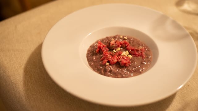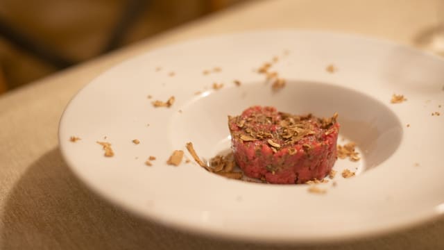 Tartare di manzo (200gr) condita con sale, olio, bottarga d’uovo, cipolla caramellata e cialda di parmigiano.