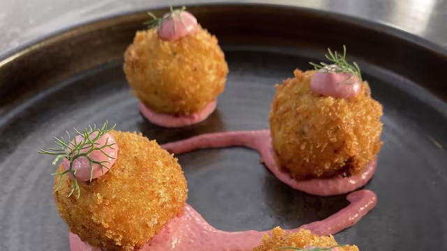 - Crocchette di pollo brasato alla birra, panate con chips, servite con salsa alla nduja