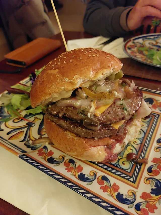 - Doppio hamburger, gorgonzola, cheddar, peperoni, funghi, pancetta, maionese
