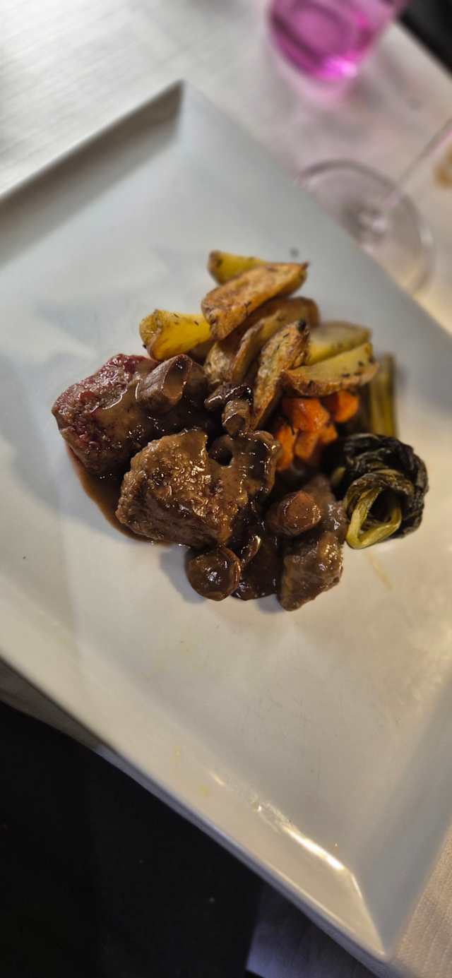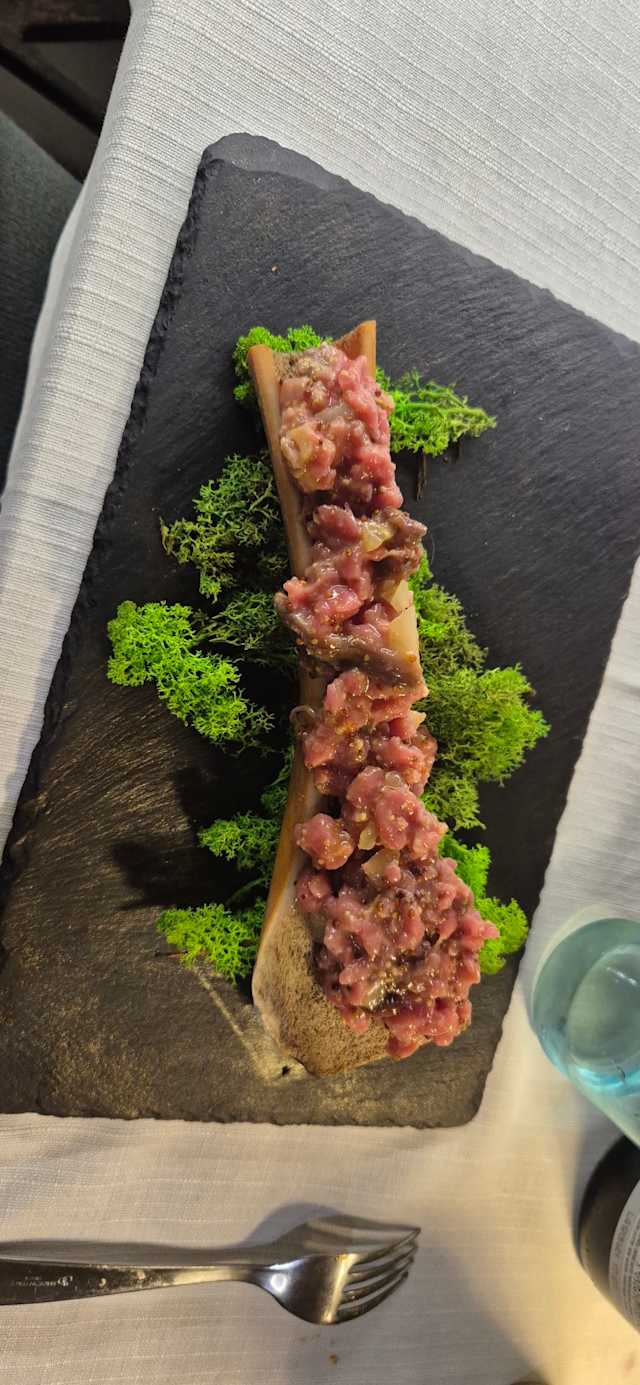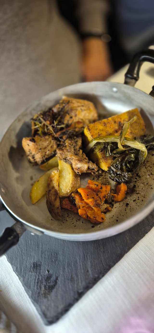 Cacciatorino di daino, petto d’anatra affumicato, capocollo di cinta senese, sálam de “braga” e mortadella di cinghiale al tartufo nero.Il tutto accompagnato da: sott’oli d’autore di stagione 2 usilì scapacc ( involtini di magatello di vitello, rosa camuna e pancetta al pepe )/ 2 capù senza ale ( involtini di verza ripieni di pane grattugiato, amaretto e grana )