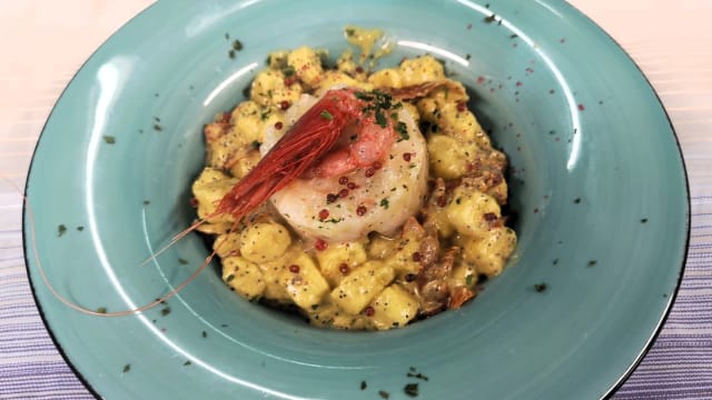 - Paccheri, pistacchio, gamberi, pomodorini, olio, prezemolo, aglio