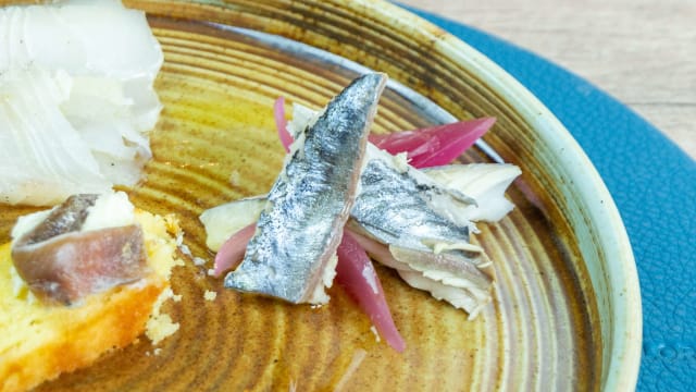 Alici marinate, porchetta di tonno, crocchetta di baccalà mantecato, gambero in crosta di patate, salmone marinato all'aneto e yogurt magro