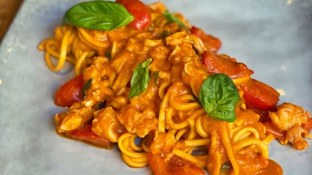 Con pescato del giorno, vongole, salsa ai tre pomodori e basilico fresco