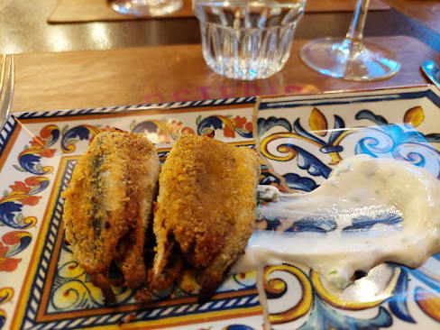 3.5/10Beautiful and staff was friendly but seemed confused Ordered the fried artichoke which came dripping with oil and the oil smelled and tasted old. Ordered a prosecco which arrived warm