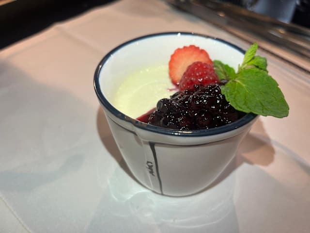 Clásico postre italiano elaborado con nata y azúcar, acompañado de confitura de frutos rojos y un toque de menta.