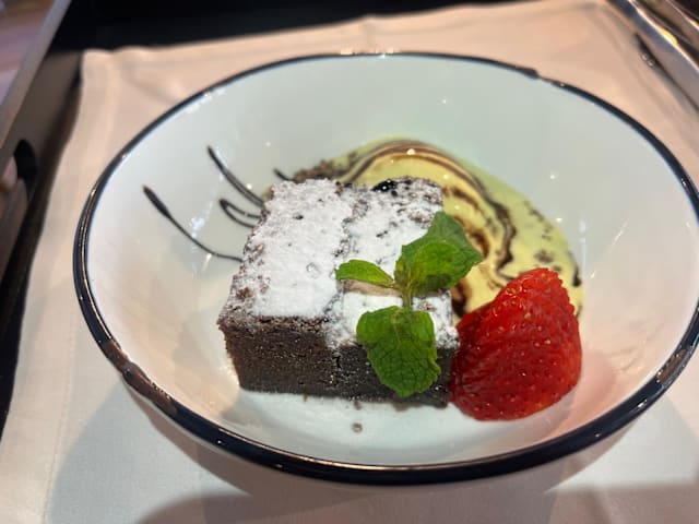 Tarta de chocolate típica italiana elaborada con almendra molida, huevos y mantequilla, acompañada de helado de vainilla y fresas