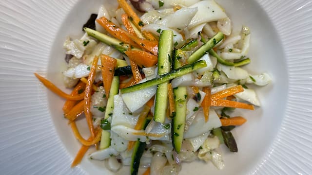 Crema di piselli freschi, stracciatella di bufala e julienne di seppie