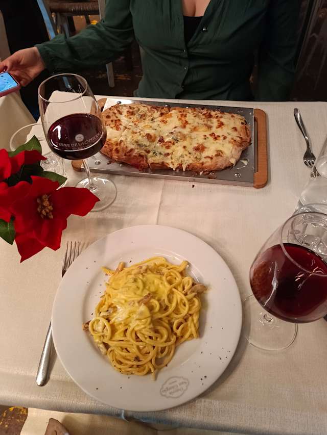 - Guanciale, uovo pasta gialla, pecorino, parmigiano, pepe nero
