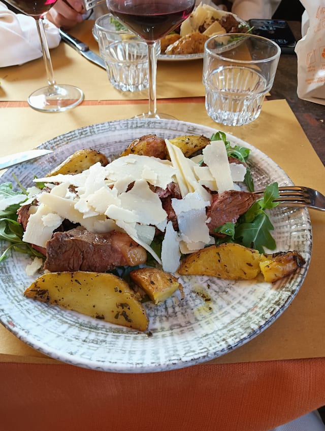 Tagliata di manzo ai funghi porcini/rucola e grana con patate arrosto