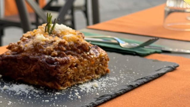 - Cheesburger di chianina IGP con pomodori, cipolla caramellata, lattuga e senape all’antica servito con patate arrosto
