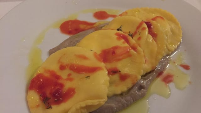 Tortelli rossi ripieni di ossobuco di vitello con finferli, robioli tre latti, nocciole e pesto di rucola