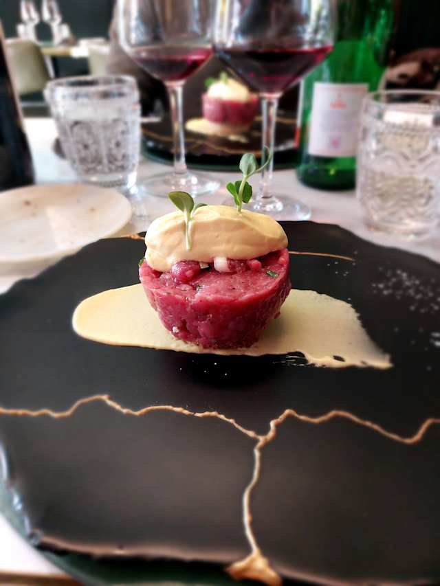 Tartare di chianina con pane croccante e maionese alle mandorle e zafferano locale