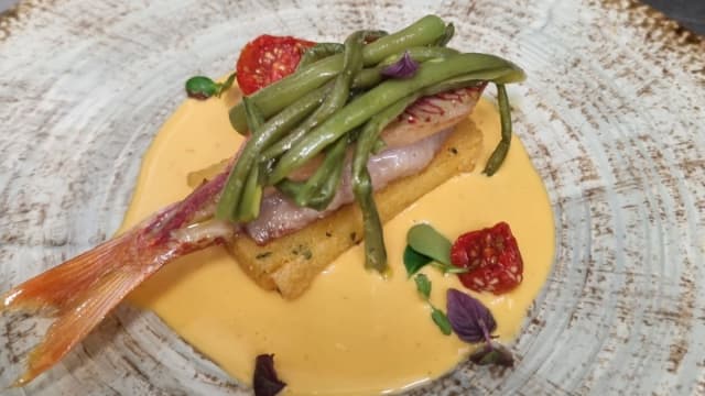Luccio piastrato alle erbe con crema di piselli,maionese di cocco, liomone croccante e taccole