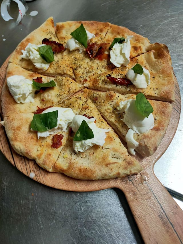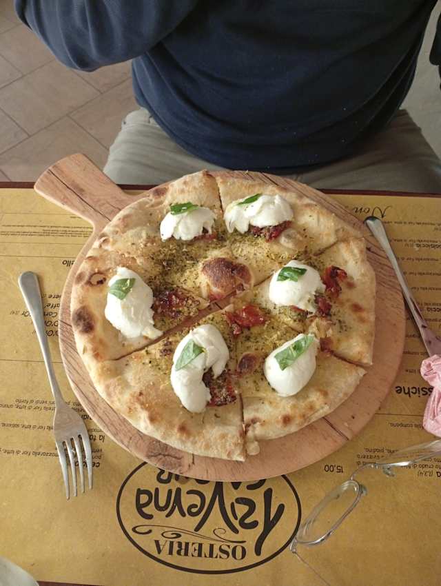 Pomodori pelati, mozzarella fior di latte, ventricina piccante, olive leccino