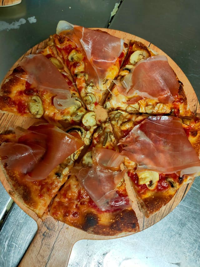 Pomodori pelati, mozzarella fior di latte, funghi champignon fresci,, salsiccia