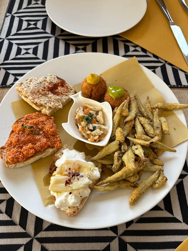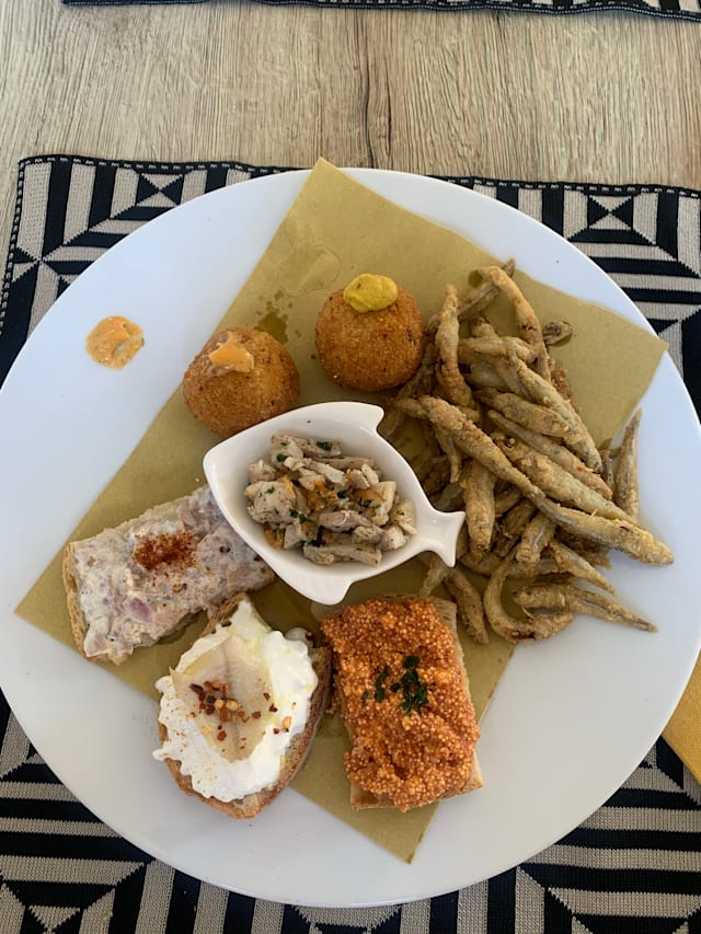 Bruschetta con patè di carpa affumicata, bruschetta burrata persico marinato , bruschetta uova di carpa, agoni fritti, insalata di persico.Polpette fritte di persico