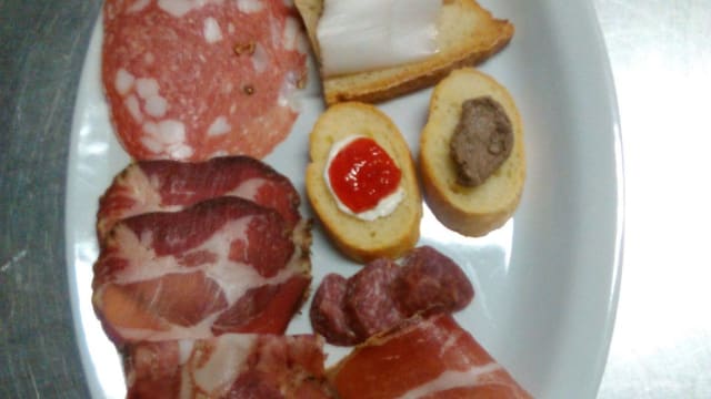 (crostini con: fegatini di pomo, robiola e marmellata di peperoni, lardo di colonnata D.O.P.)