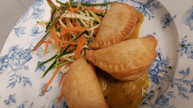 Antipasti - samoa di verdure con yogurt greco allo zafferano