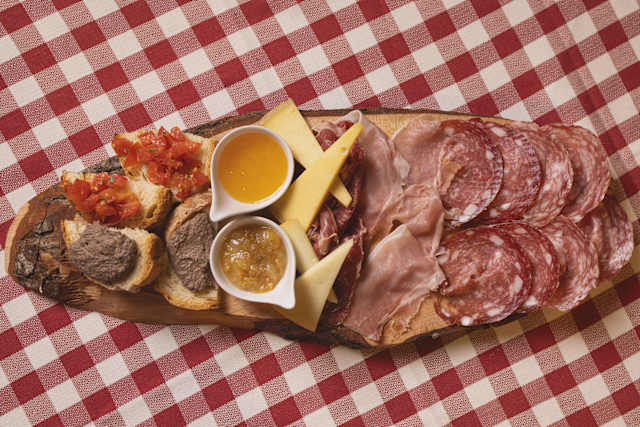 - Carpaccio di manzo su letto di rucola con grana padano e glassa balsamica