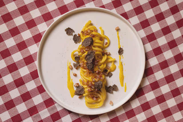 - Spaghetti alla Chitarra con pomodoro, basilico e colatura di burrata