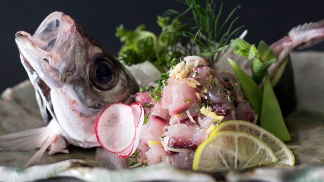 Cubetti di pesce misto, marinati in salsa ponzu, serviti con pomodorino ciliegino, mango,