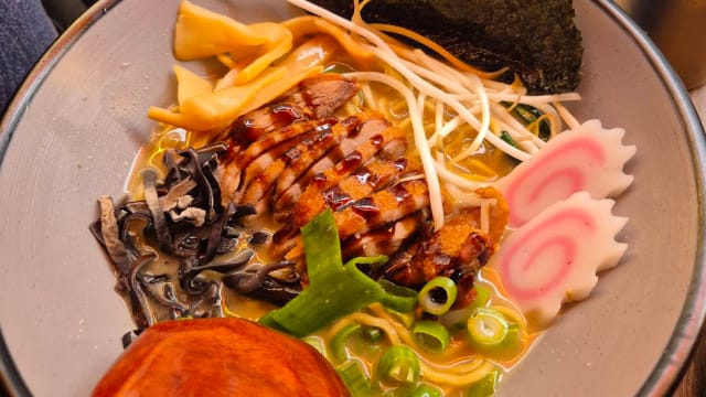 (ramen con caldo de cerdo y salsa de soja, filete de pato y huevo ajitama)