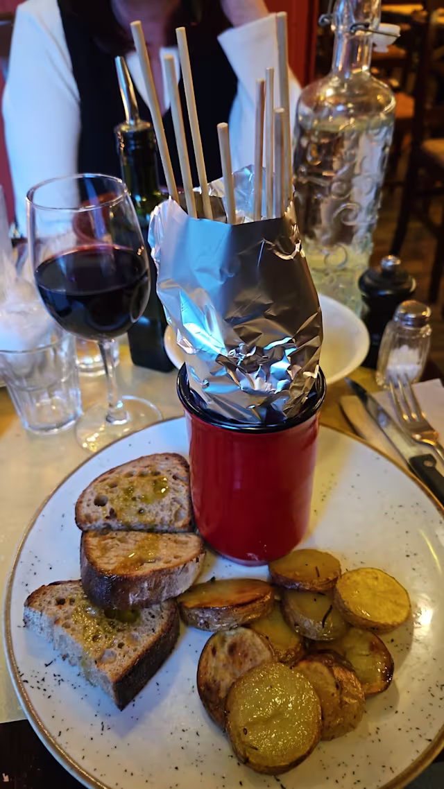 - (Spiedini di carne di pecora), pane e olio, patate al forno