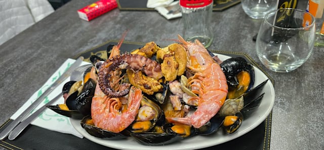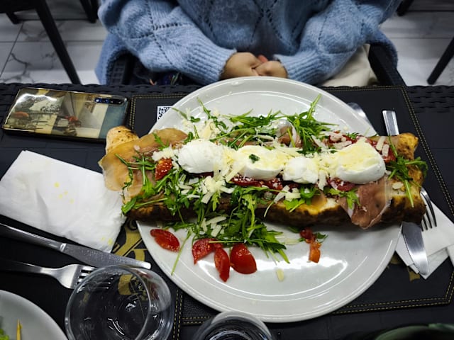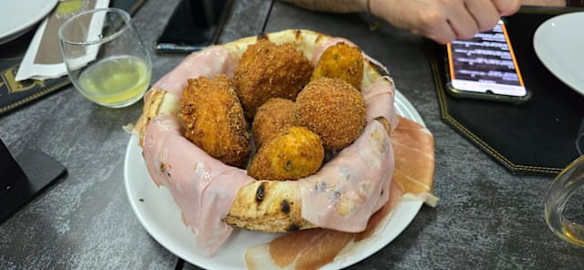 Con tarallo, lupini, olive verdi, ciliegine di bufala choux con mousse di ricotta e zafferano, fiori di zucca, miele, confettura, bruschette e parmigiana di melanzane.