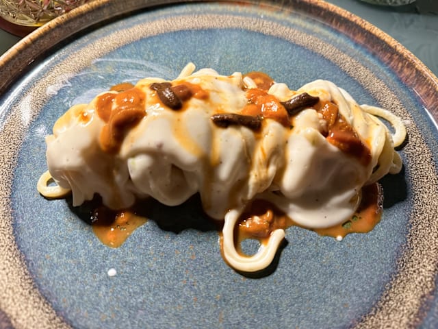 Cannellone ripieno di genovese con crema al pecorino e salsa al prezzemolo