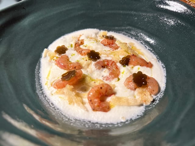 Spuma di provola affumicata, gambero crudo, cialda di riso e pickle di kombu