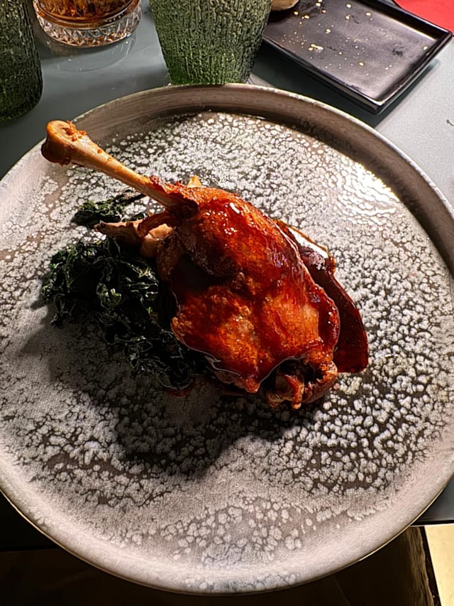 Coscia d’anatra confit con riduzione al miele lattofermentata ai frutti di bosco, cardoncelli e cavolo nero