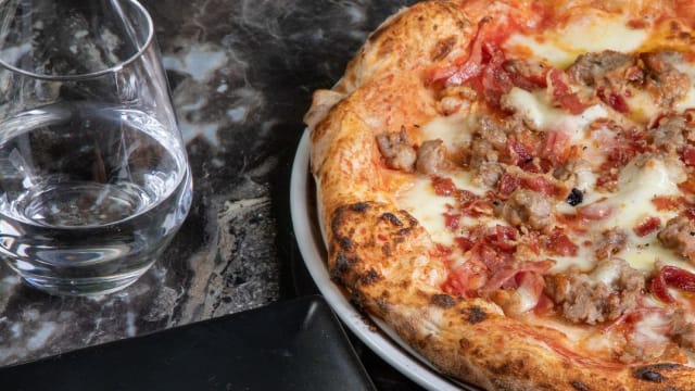 Ombra di pomodoro di san marzano dell’agro sarnese-nocerino dop, salame napoli, bacon croccante, salsiccia di maiale razza casertana sbriciolata firodilatte, basilico, olio extravergine d’oliva dop