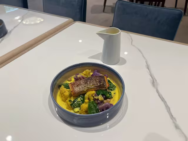 - Saumon des alpes (40g), radis, poivrons, betterave, carottes, lentilles vertes et vinaigrette miel, gingembre & curcuma