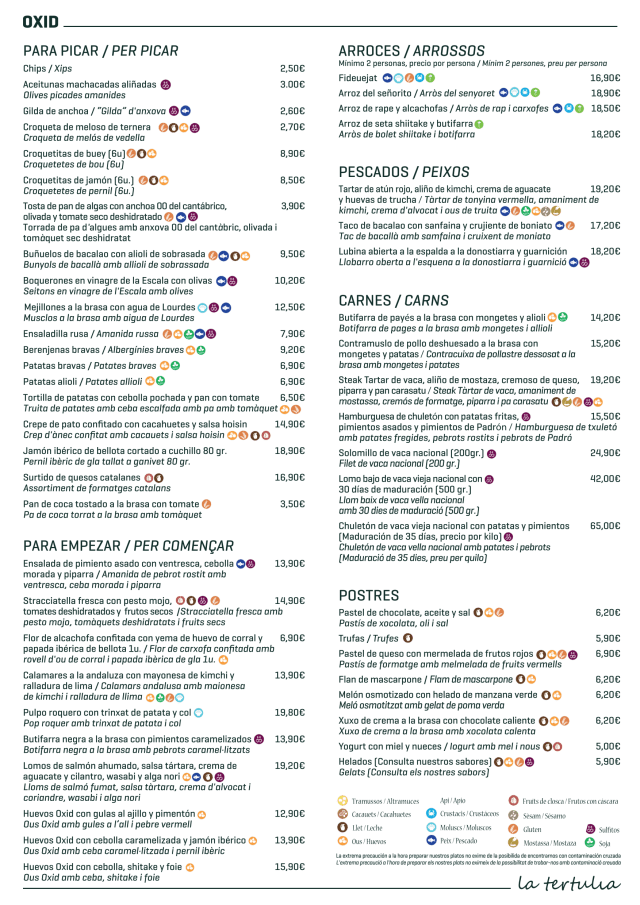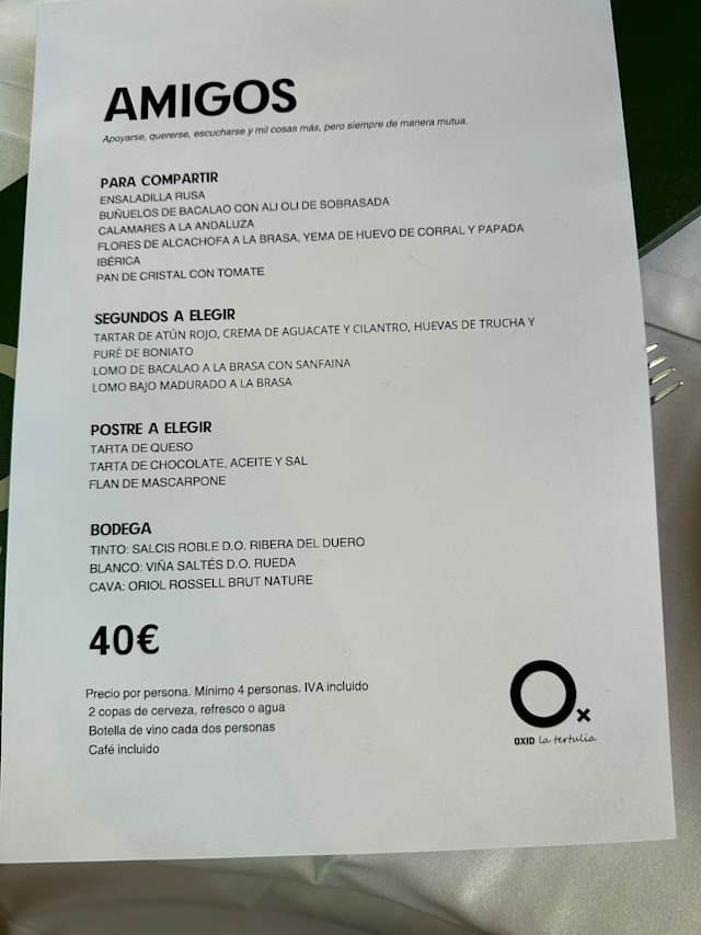 10/10Oxid La Tertulia Was just what we were looking for in Barcelona. Great ambiance and neighborhood feel. All the staff was welcoming and warm. As travelers, we always like to see local people at the restaurant, and this didn’t disappoint. The menu was a great mix of traditional dishes that offered everyone something to eat or share.