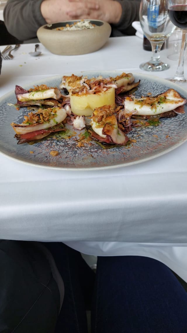 Chipirones rellenos de moriclla de wagyu con ajillo de pimientos y jamon iberico