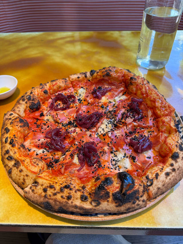 Salsa de tomate gustarosso, gorgonzola d.o.p, spianata picante, cebolla estofada y polvo de aceitunas