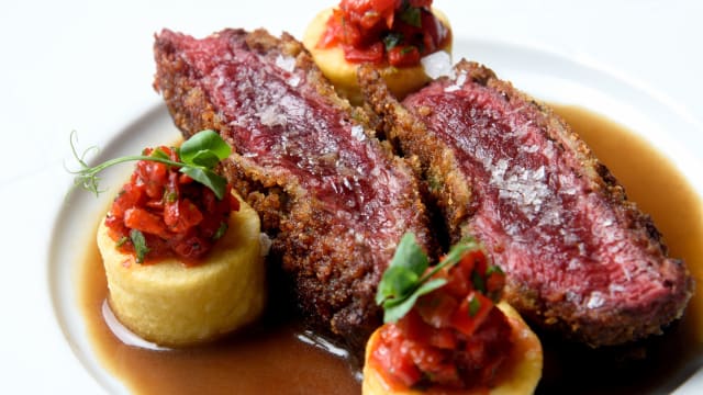 Solomillo de vaca “marela” nacional madurado discarlux servido con una capa de “muddica” – migas de pan aromatizada como se comerìa en palermo.