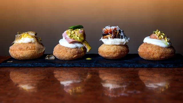Pizzetta fritta al momento con fondue de parmigiano reggiano 24 meses, yema de huevo curada en sal y azucar y trufa negra