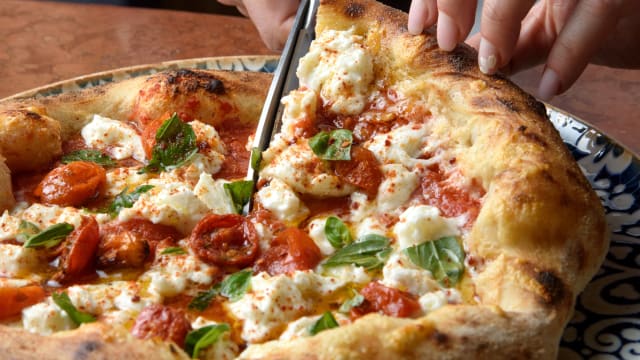 Salsa de tomate y tomatitos, trenza de bufala dop, prosciutto crudo di parma, aceite evo y bordes relleno de ricotta