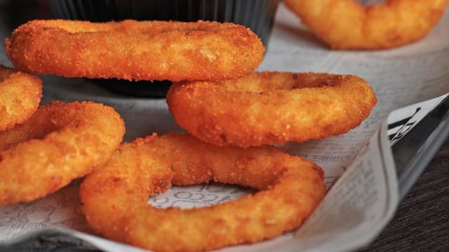 Aros de cebola panados e fritos. Acompanhada por molho cocktail.