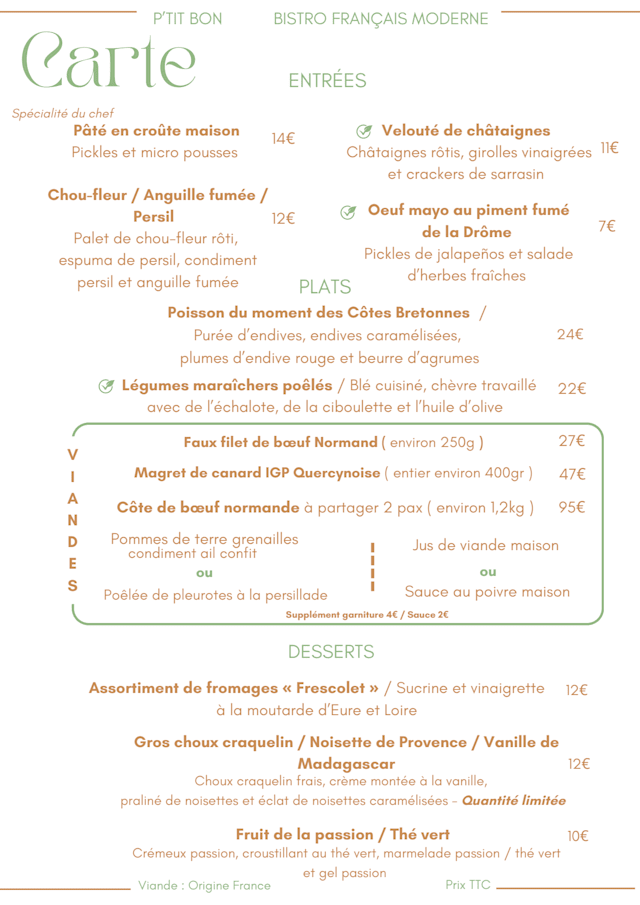 10/10Wonderful evening at P’tit Bon where we were made to feel really welcome. Fabulous wines by the glass, perfectly cooked fish and interesting flavours. The desserts (we tried them all) were a triumph! We will be back!