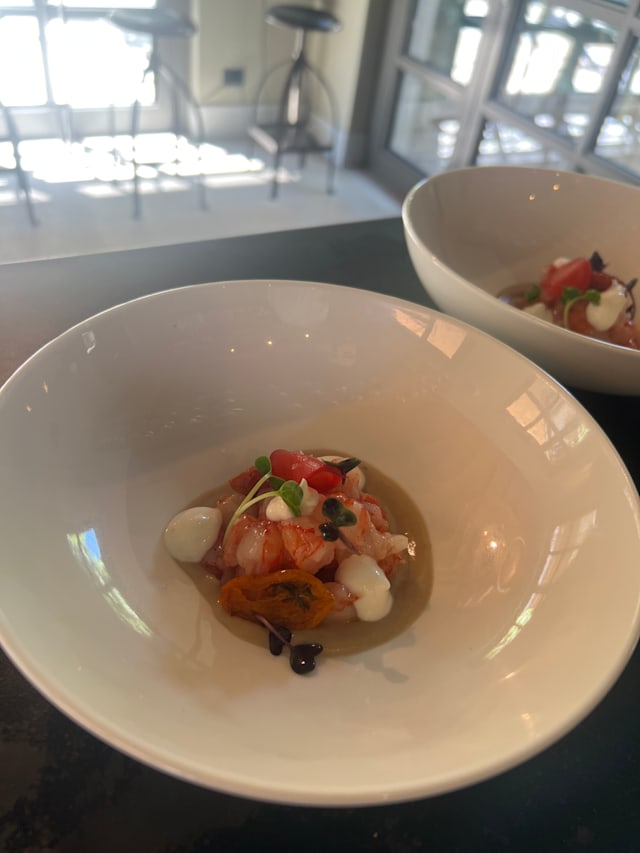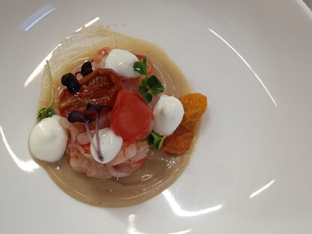 Tartare di gamberi, crema di pane, pomodoro confit e stracciatella